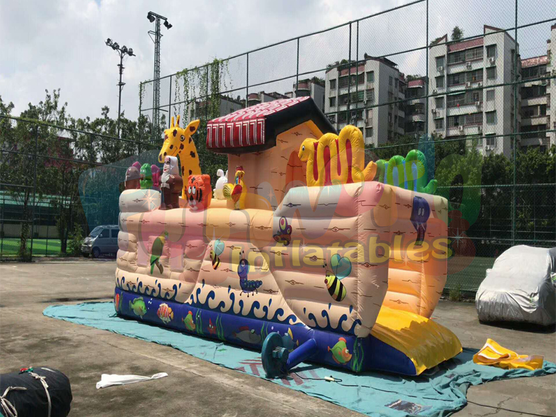 Ao entrar no inflável, eles podem ultrapassar os muitos obstáculos e obstáculos e observar os diferentes animais em direção ao grande escorregador na saída.
