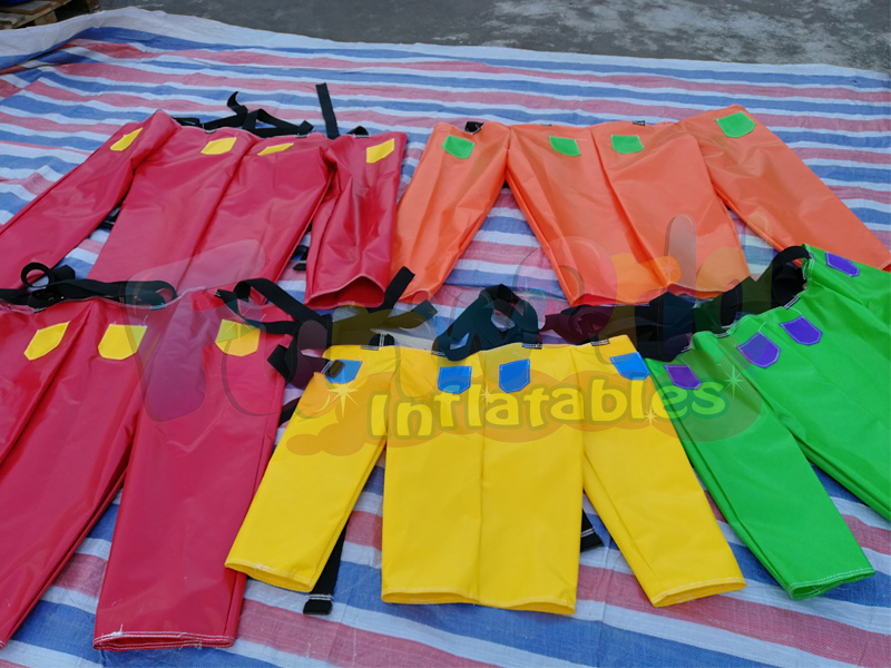 Comandando o jogo de calças infláveis. Atenda 3 pessoas. Temos de tentar correr em sincronia para alcançar o objetivo.