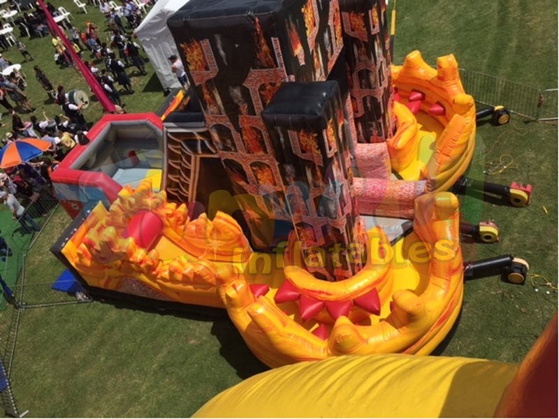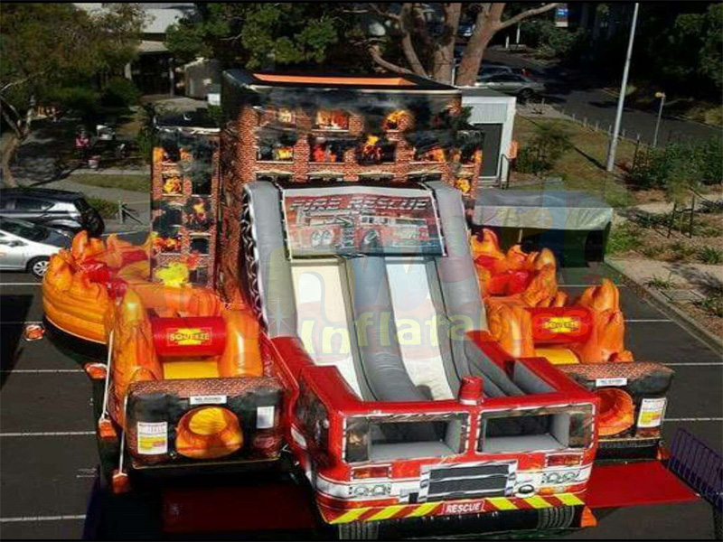 Teste suas habilidades com este divertido e emocionante desafio de resgate de fogo. Este desafio de obstáculo inflável com tema de resgate de fogo tem um slide gigante com curso de obstáculo anexado. Entre pelas laterais, esprema-se pelo túnel, corra ao redor dos obstáculos e suba a escada para descer o escorregador.