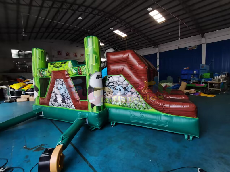 Bu şişme panda fedai, tırmanma rampası ve kaydırağı olan büyük bir şişme zıplama evidir. Yaklaşık 8-10 çocuk kapasitelidir. Oyun günü bittikten sonra fermuarlı kapaklar, korumanın havasının kolayca söndürülmesini ve saklanmak üzere indirilmesini sağlar. Bouncer, dik sütunlarından ve kirişlerinden kayar duvarlarına kadar %100 PVC vinilden yapılmıştır. Seken yüzey, şilte kenarları, alt kısım ve kaydırak dahil olmak üzere tüm yüksek gerilimli alanlar, endüstriyel dayanıklılığa sahip 18 ons (0,55 mm) PVC'den yapılmıştır. Bu delinmeye dayanıklı PVC malzeme, daha düşük kaliteli birimlerde kullanılan naylondan çok daha güçlüdür (yaklaşık 5 kat daha güçlüdür), çünkü yırtılmaz, solmaz, kullanımla yıpranmaz veya küflenmez ve temizlenmesi çok daha kolaydır."