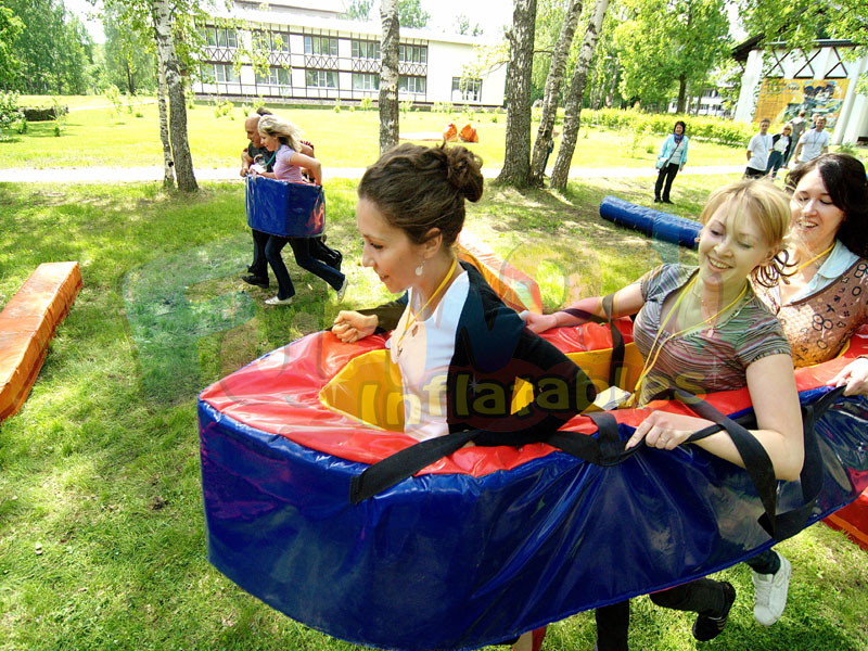 Attraktion für Teamstaffelrennen. Drei Mitglieder eines Teams kommen in die Löcher des aufblasbaren Rennbootes, fixieren es mit Riemen an den Schultern und laufen, versuchen dem Gegner voraus zu kommen.