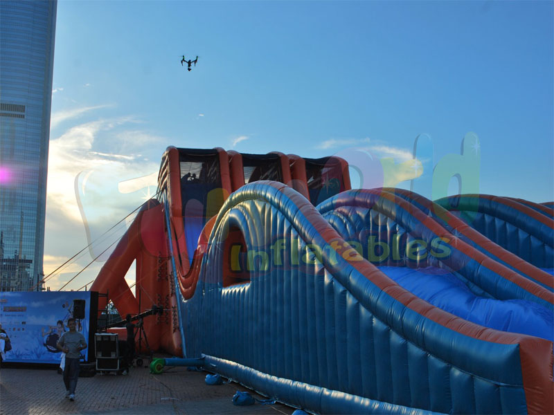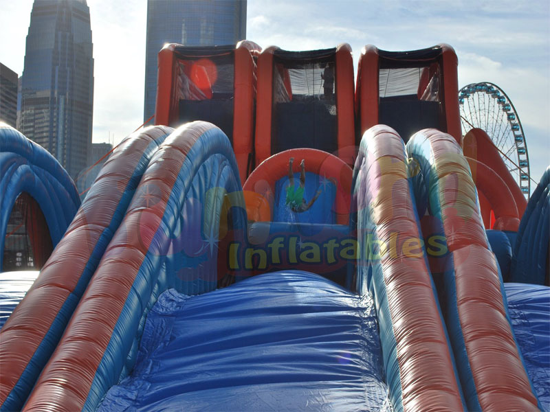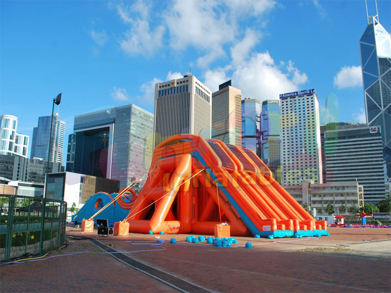 Diese aufblasbare Wasserrutsche wird mit einem starken großen Rohrrahmen unterstützt, und der Rahmen wurde erneut mit mehr Rohrstrukturen verbessert. Durch den Rohrrahmen ist diese riesige Wasserrutsche für das große Vergnügungsprojekt relativ leicht. Das Gleitblech ist aus besonders rutschigem Material, glatt.