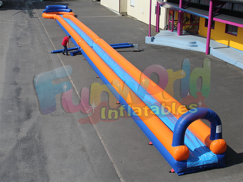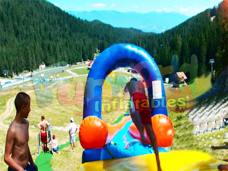 Die Superglissade ist eine sehr lange Wasserrutsche von mehreren hundert Metern auf einer aufblasbaren Matratze. Das Wasser wird von der Oberseite der Bahn (1. Modul) geschickt, das aufblasbare Gleit- und Gleittuch wird dann sehr rutschig gemacht, es bleibt nur zu starten. Damit der Benutzer nicht mitten im Gleitflug stehen bleibt, ist eine Steigung von mindestens 20% erforderlich. Auf jeder Seite des Gleitstücks nähen wir die Matratze der Rollen, um die Benutzer zu schützen. Am Ende der Rutsche endete der User in einem Zielbereich von Ø4,7m. Verbinden Sie die 20m Module, um eine Superfolie + auf Ihre Länge zu komponieren.
