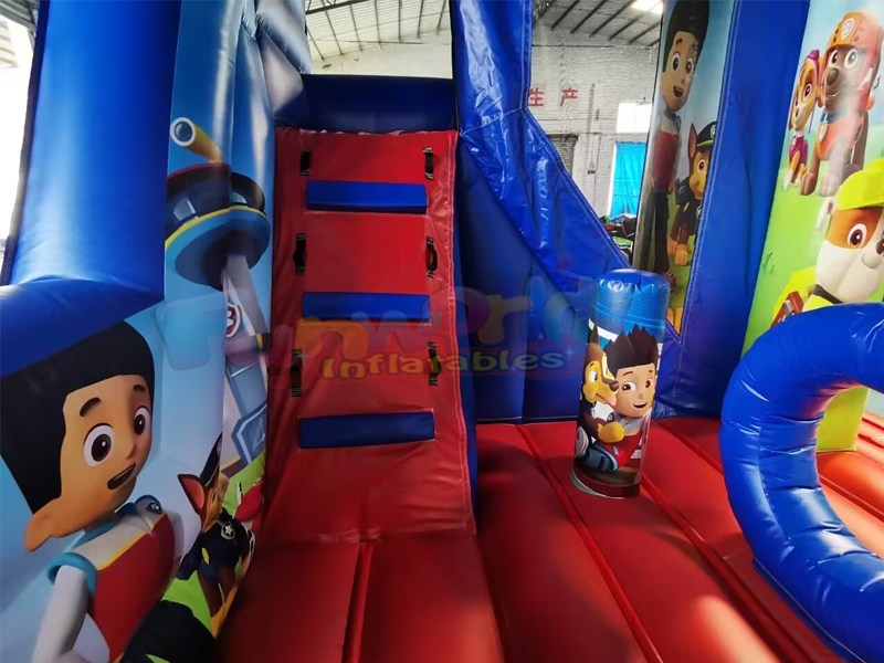 Dit opblaasbare Paw Patrol-uitsmijter is een groot opblaasbaar springkussen met klimhelling en glijbaan. Beschikt over een capaciteit van ongeveer 8-10 kinderen. Nadat de speeldag voorbij is, zorgen de flappen met ritssluiting ervoor dat het wipstoeltje gemakkelijk kan worden leeggelaten en kan worden opgeborgen. Het wipstoeltje is gemaakt van 100% PVC-vinyl, van de rechtopstaande pilaren en balken tot de glijwanden. Alle gebieden die zwaar worden belast, inclusief het springoppervlak, de zijkanten van de matras, de bodem en de glijbaan, zijn gemaakt van industrieel sterk PVC van 0,55 mm (18 ounces). Dit prikbestendige PVC-materiaal is veel sterker (ongeveer 5x sterker) dan nylon dat wordt gebruikt in eenheden van mindere kwaliteit, omdat het niet zal scheuren, vervagen, verslijten bij gebruik of beschimmelen, en het is veel gemakkelijker schoon te maken."