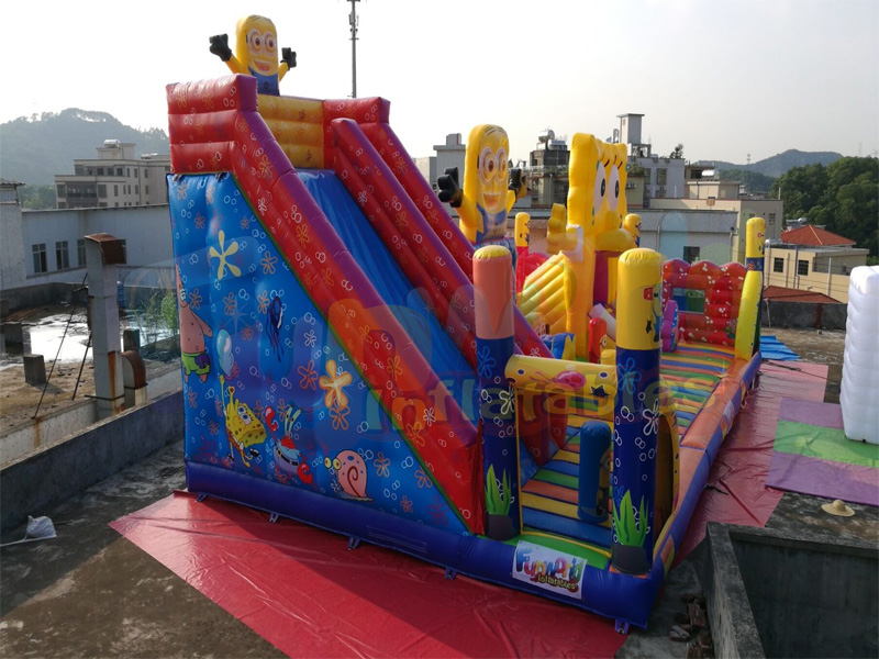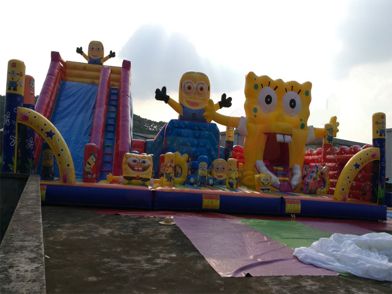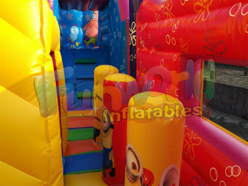This is the spongebob bounce house biggest inflatable playground for kids. It have so much obstacle course, animal, jungle inside the jumping part of this inflatables. It also have a slide on the left one . Anykids can sliding there. It bring so much fun for you.