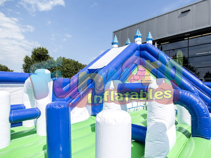 Funworld inflatable now also has this large play area available in 10 x 20 meters. The inflatable play park castle world 10 x 20m is perfect for in a gym or outside on the football field. Furthermore, these big inflatable slides on sale are very suitable for larger events. Morover, there is room for many children and they will spend hours enjoying the many obstacles, slides and the climbing tower.