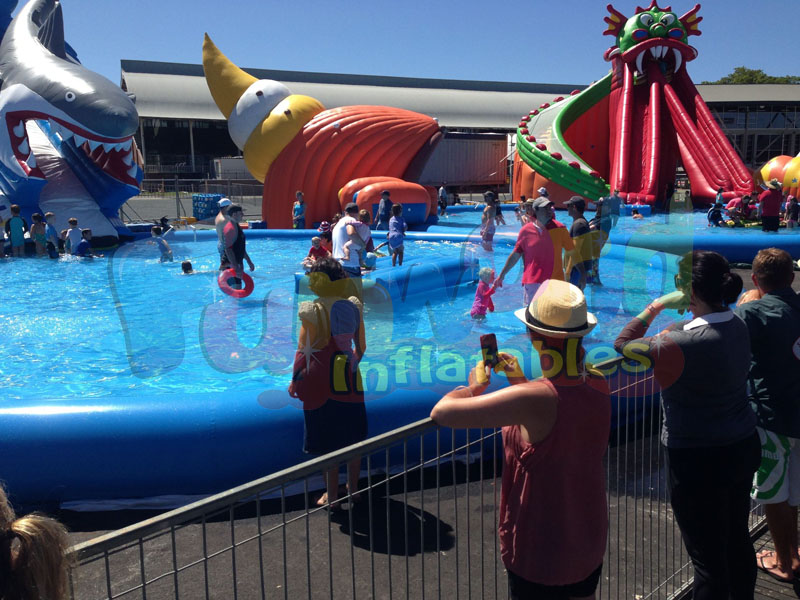 Suit up and prepare for battle! With 3 inflatable pool slide and 2 protective barricades, you’ll have a blast challenging your friends to the ultimate water battle. Scale up the climbing wall and take a quick shot at your opponent from the overhead water park slides before plunging down the curved slide. Run for cover behind the barricade and make your way over to one of the inflatable pool floats to keep the battle going. You can also challenge a friend to a game of one-on-one With the included continuous airflow blower, all of this fun inflates in less than 3 minutes. Heavy-duty Dura-Tech construction ensures lasting strength and durability. You’ll have a blast!