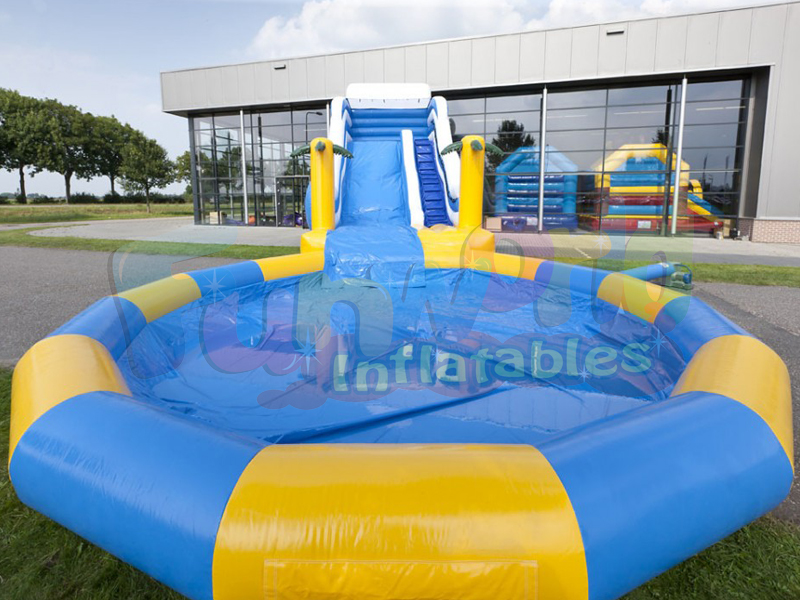Children and adults slide down into the pools from the inflatable trippo slide which has the sprayer, which is very interesting.