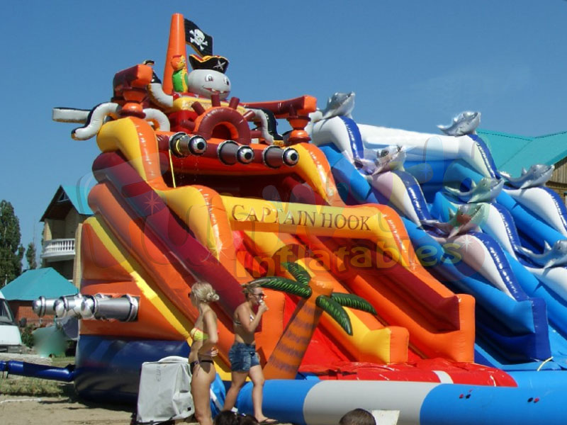 Captain Hook - a children outdoor inflatable games, which includes a slide and a trampoline. You can install such an rectangle blow up pool both on the street and in a spacious room. Unusual, cheerful appearance constantly attracts children's attention. From this design, you can make a conventional, classic slide, simply removing all the extra details. The inflatable water slides is capacious, easy to assemble and install, takes up little space when stored.