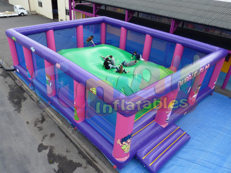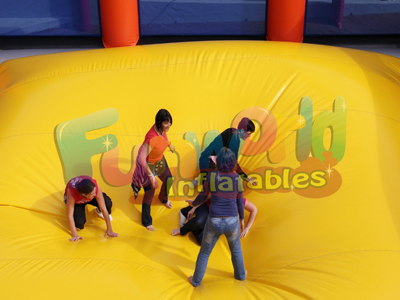 Banana Peel is a soft XXL dome. With its size of 12x11m this game can accommodate 40 people at the same time. The inflatable jumping castles is simple children must try to walk, to balance on the soft dome, knowing that other children move the dome, a very fun game ... nets on the sides protect the players. on each side of the dome are strips of mattresses, to enlarge the reception area out of the dome. The front entrance is specially designed to manage the public (entry & exit), and also to avoid as much as children leave the sport inflatable without having decided. The high height of the nets protects children during jumps. The facade decoration (optional) is hand painted by painters.