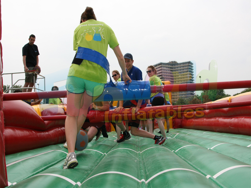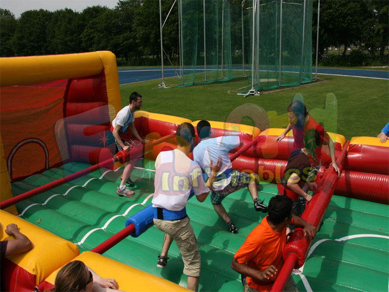 ابحث عن طاولة كرة القدم الخاصة بك ليوم ناجح مضمون. يتنافس فريقان من 6 أشخاص ضد بعضهم البعض في هذا الحقل الضخم لكرة القدم القابلة للنفخ. لأن المشاركين عالقون في الأنابيب ، يمكنهم فقط التحرك لليسار واليمين. أرضية قابلة للنفخ من طاولة المعيشة لكرة القدم الجذب نفخ كرة القدم يجعل من الصعب للغاية تسجيل. جرب الآن ما تشعر به كدمية في لعبة كرة قدم الطاولة. الكثير من الأطفال يحبون هذا