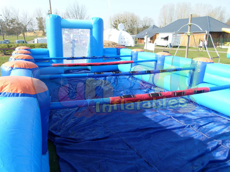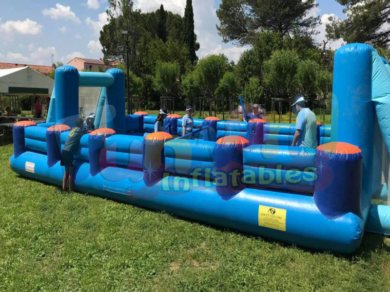 هذه فووسبالل البشرية القابلة للنفخ تبلغ مساحتها 52.50 مترًا مربعًا مع هدفين ثابتين للنفخ مع شبكات ومكبر يعترض السقوط بأمان ويمكن أن يستقبل فريقين من 5 لاعبين بحد أقصى في منطقة الجذب هذه القابلة للنفخ.