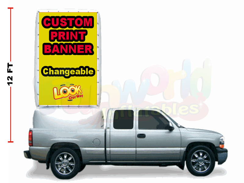 عملاق نفخ لوحة الإعلانات المنقولة بنيت لأحجام القياسية التي تم شحنها بالشاحنات. هذا قدم 12 قدم طويل x 6.5 قدم طويل × 4 قدم أعلام الإعلان نفخ السرير شاحنة عميق مصنوع من 420 المنخر عالية البولياميد 0.28 مم (المواد المثلى). تأتي هذه اللافتات القابلة للنفخ مصحوبة بنظام "نظرة سريعة" ، نظام تغيير سريع ، حيث يمكنك بسهولة إزالة الشعار الأصلي واستبداله بشعار طباعة مخصص آخر في أقل من دقيقة واحدة.