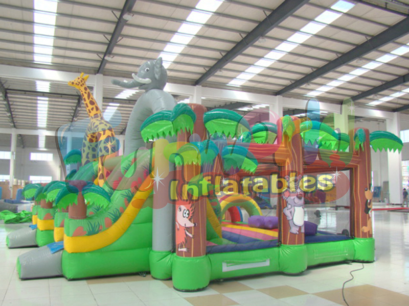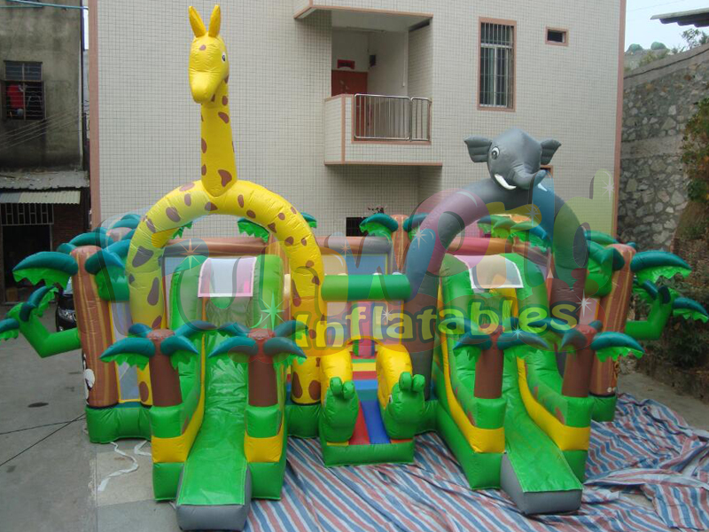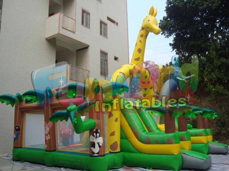 القلعة نفخ الغابة يأتي مع حياة كبيرة مثل شريحة الزرافة ، فضلا عن منطقة ترتد كبيرة خلق متعة لمجموعات من الأطفال. تصميم الزرافة هو ضرب مع الأطفال الصغار ويعمل بمثابة مصد للأمان حتى لا يمكن سقوط أطفالك. يسهل الوصول إلى الشريحة لجميع الأطفال باستخدام مزيج من الثقوب والأقدام لمساعدة أطفالك على الصعود. هناك ميزة إضافية لنفق يؤدي إلى منطقة الارتداد ، مما يؤدي إلى مدخل إضافي للدخول إلى القلعة النطاطة.