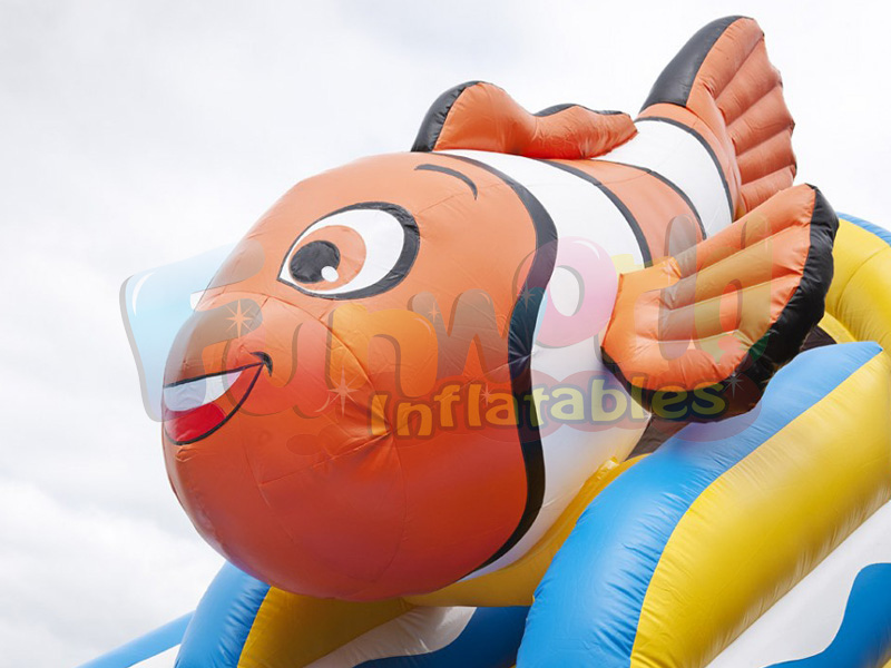 قلعة القفز في مدينة قوانغتشو هي متعة وجاذبية مذهلة لأي حدث. الألوان الجذابة والمرح على الظهر ستجذب الأطفال من أي عمر. تم تصميم هذه الشريحة القابلة للنفخ مع سمكة مهرج كبيرة في الأعلى بشكل كامل مع موضوع عالم البحار. الشريحة هي عين رائعة وجميلة وسهلة الإعداد والتنظيف.