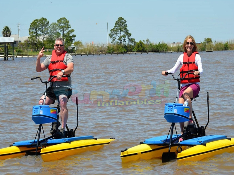 A Water Bike é uma verdadeira bicicleta capaz de pedalar na água. Um quadro leve de bicicleta é montado em 2 flutuadores infláveis. O uso de grampos de liberação rápida permite desmontar a bicicleta aquática de forma rápida e fácil e armazenar todas as peças em uma bolsa dentro do carro. A bicicleta aquática é feita com estrutura em liga de alumínio 6061 e hélice em liga de alumínio. O sistema de correia de transmissão é à prova d’água e antiferrugem.