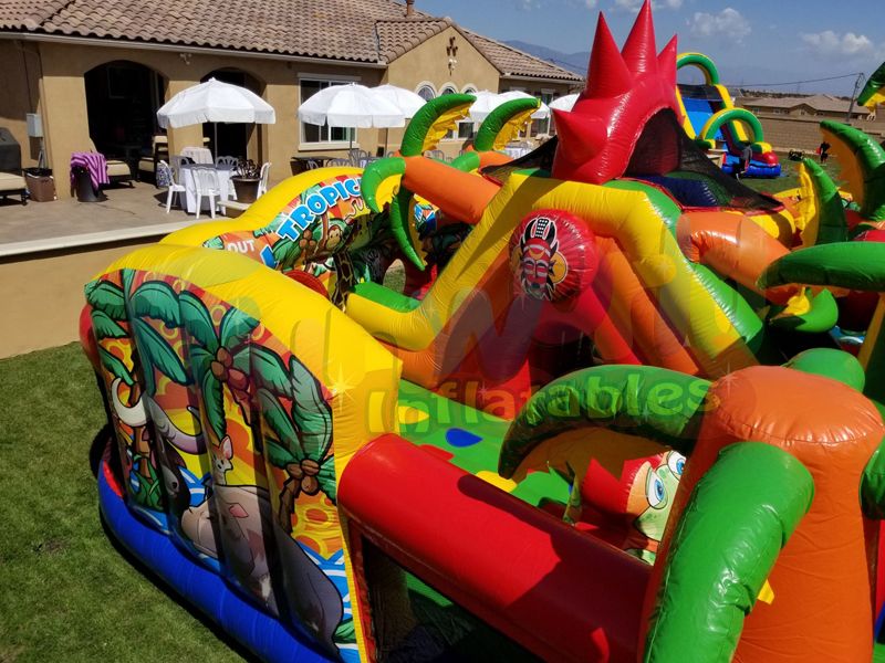 Este laberinto tropical de animales de la jungla hará que los participantes jueguen y salten durante horas y horas. Esta unidad de cebra inflable es perfecta para edades de 2-8. Los participantes ingresan al laberinto desde el lado izquierdo e inmediatamente trepan por el primer tobogán decorado con palmeras inflables. Luego se deslizarán por debajo del primer túnel. Allí pasarán por un obstáculo emergente y subirán la segunda diapositiva. Después de la segunda diapositiva, se deslizarán hacia la primera de dos áreas de salto. Después de arrastrarse por el último túnel, estarán en la segunda área de salto y saldrán por el lado derecho del laberinto de obstáculos inflables.