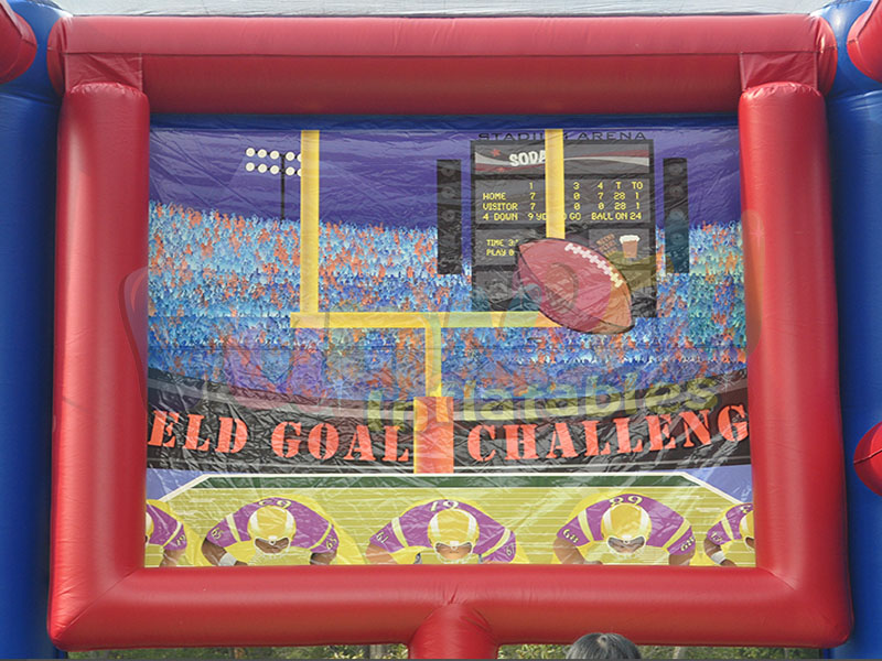 El arte del fondo también se puede personalizar con los colores de tu equipo favorito. ¡Prepárate para el desafío de gol de campo inflable para tener la mejor fiesta de Super Bowl o fútbol! Incluso podemos configurar el arte del telón de fondo para reflejar los equipos locales, no simplemente los principales equipos profesionales.