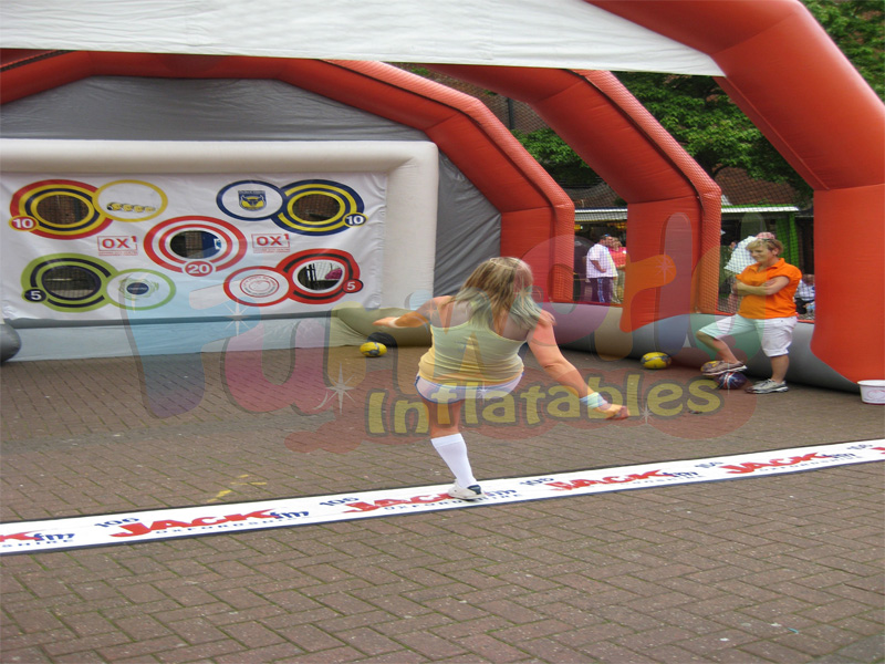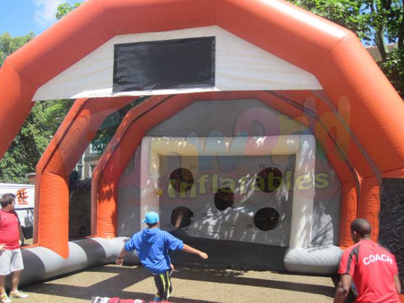 Esta es una estructura inflable deportiva de juego de tiro de puerta de fútbol. El inflable deportivo es muy divertido y atractivo, gracias a una estructura de contención importante construida alrededor de la puerta inflable. Esta estructura de tiro inflable es ideal para organizar competiciones, concursos, torneos y juegos de premios.