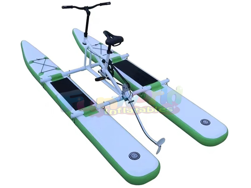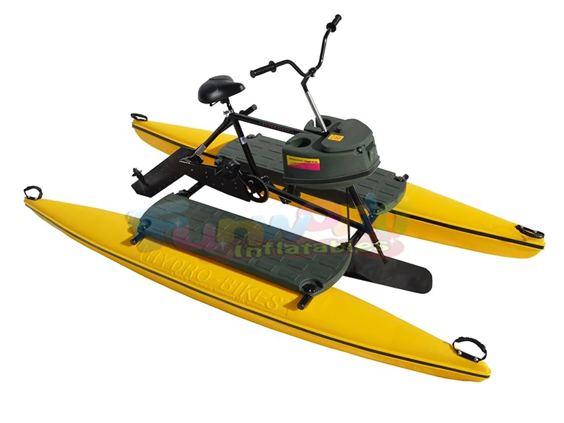 La Water Bike es una verdadera bicicleta capaz de circular sobre el agua. Un cuadro de bicicleta liviano está montado sobre 2 flotadores inflables. El uso de abrazaderas de liberación rápida te permite desmontar rápida y fácilmente la bicicleta acuática y guardar todas las piezas en una bolsa dentro de tu coche. La bicicleta acuática está fabricada con un marco de aleación de aluminio 6061 y una hélice de aleación de aluminio. El sistema de correa de transmisión es a la vez impermeabilizante e inoxidable.