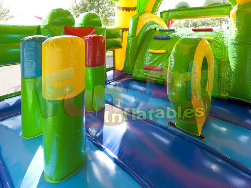 El castillo súper hinchable de cocodrilo Multiplay es muy extenso con un tobogán doble, obstáculos que los niños pueden saltar por encima, objetos en 3D y una piscina profunda. Además, el grupo de inmersión se encuentra en la parte inferior del inflable en el borde del tobogán. Los adultos gorilas saltadores es una gran atracción para jóvenes y mayores. Además, no solo los niños, sino también los adultos pueden escalar, jugar y deslizarse en este desafiante inflable.