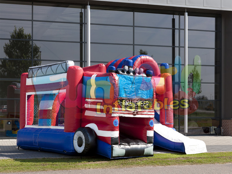 Camión de bomberos Multiplay Inflable con tobogán es sutable para parque infantil.