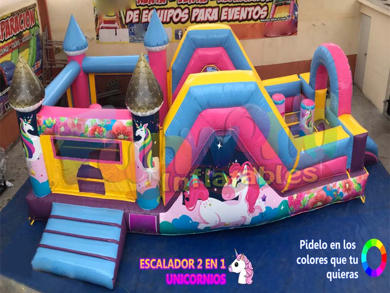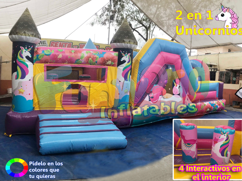 La casa de rebote de unicornio seguramente será un éxito en el cumpleaños de su hijo. Esta casa de rebote comercial tiene un piso de rebote grande y un tobogán grande que se puede usar como tobogán de agua. Todos los niños amarán estar rodeados de vinilos brillantes que no encontrarás en ningún otro lugar.