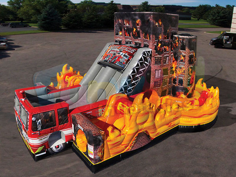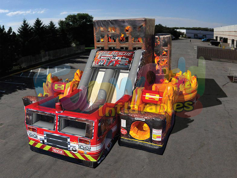 Pon a prueba tus habilidades con este increíble divertido y emocionante Fire Rescue Challenge. Este Obstáculo inflable temático Fire Rescue tiene un tobogán gigante con una pista de obstáculos adjunta. Entra por los costados, aprieta el túnel, corre alrededor de los obstáculos y sube la escalera para deslizarte por el tobogán.