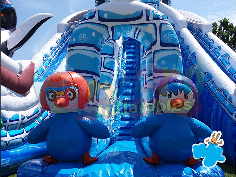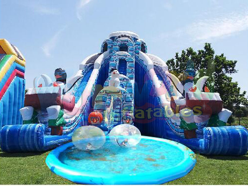 Se puede fabricar en cualquier tema, aunque este es específicamente para el advenimiento del verano. Es increíblemente seguro y es ideal para todas las edades de los niños. Los hinchables temáticos Summer Advent se están volviendo más populares a medida que los eventos previos a la Navidad son cada vez más populares. Este tobogán inflable con piscina de agua es muy divertido para los niños. Los niños pueden nadar al final del tobogán inflable de pingüino.