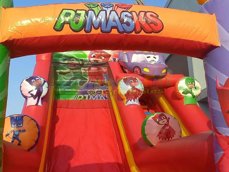 ¡Es tiempo de fiesta! ¡Este tobogán de PJ Mask es emocionante y es hora de saltar y deslizarse! Este juego combinado inflable es un inflable divertido y llamativo. Además, el tema de la fiesta se puede encontrar dentro y alrededor del castillo hinchable. Dibujos animados inflables de alta calidad con fina impresión digital, el diseño y el estilo se pueden personalizar según sus requisitos."