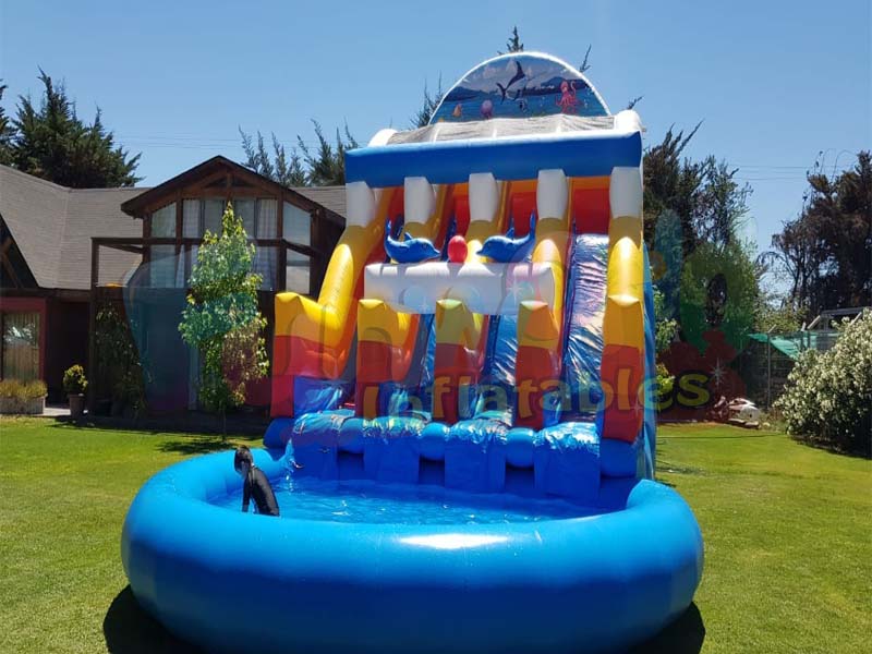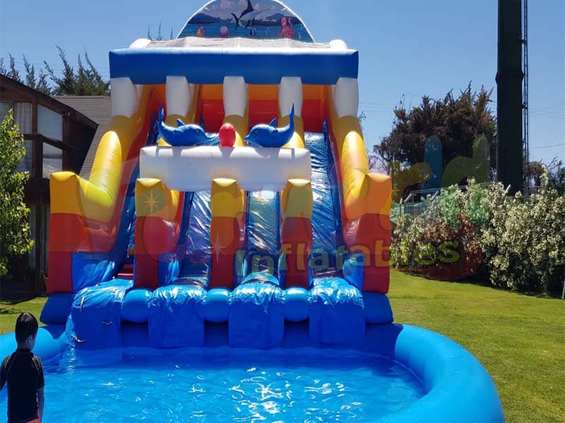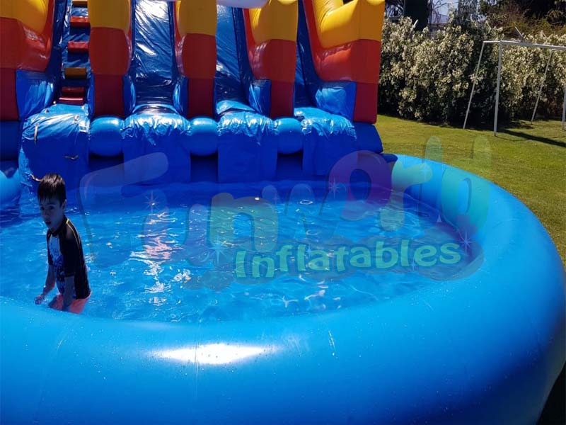 Este es nuestro tobogán inflable para niños. Se utiliza principalmente para grandes eventos, ferias escolares, fiestas callejeras o alquiler privado. El tobogán de agua inflable Slippity Slide puede ser utilizado por niños de cualquier edad e incluso adultos. No es para los débiles de corazón, ya que ciertamente estás muy lejos del suelo en la parte superior. Este tobogán inflable con piscina ciertamente tiene el 'factor sorpresa'.