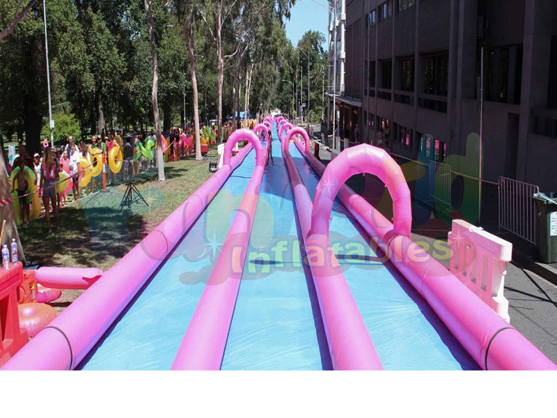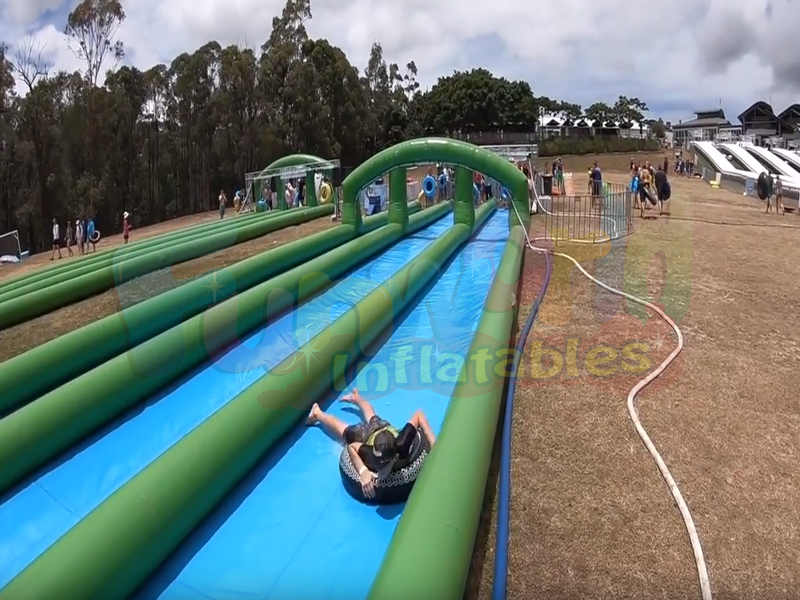 Los toboganes acuáticos a la venta son un tobogán acuático muy largo de varios cientos de metros sobre un colchón inflable. El agua se envía desde la parte superior de la pista (1er módulo), el tobogán inflable y el tobogán para el parque acuático se vuelve muy resbaladizo, solo queda para lanzar. Para que el usuario no se detenga en medio del deslizamiento, es necesario tener una pendiente del 20% como mínimo. A cada lado del deslizamiento, cosimos el colchón de los rollos para proteger a los usuarios. Al final de la piscina, el usuario finalizó en un área de llegada de Ø4.7m. Conecte los módulos de 20 m para componer un súper portaobjetos + a su medida.