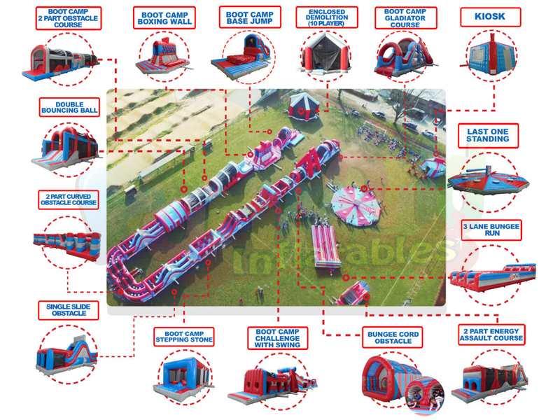 Bu 180m dev şişme engel kursu. Büyük engelli kurslarımız normalde çeşitli oyunlar, tırmanışlar, taramalar, zorluklar ve slaytlardan oluşmaktadır. Tasarım departmanımız, uluslararası pazarda görülen en orijinal ve heyecan verici ürünlerin bazılarından sorumludur. Bir HUGH OBSTACLE OLUŞTURUYORUZ, aynı zamanda küçük, yönetilmesi kolay modüllerde de mevcut
