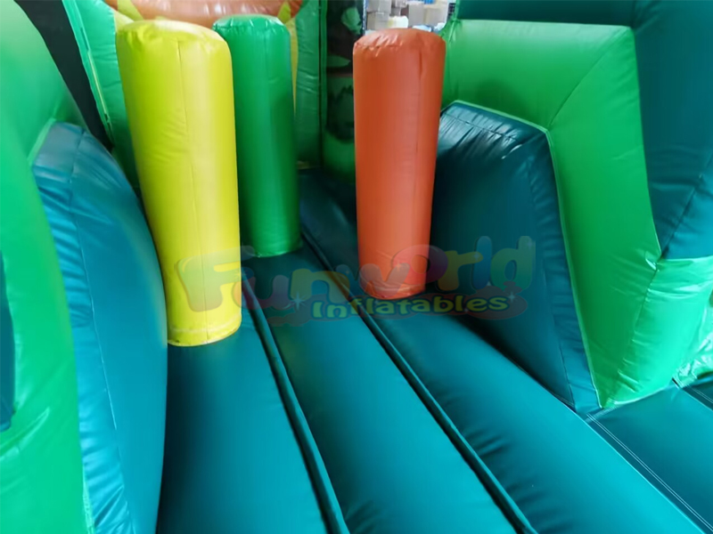 Bu şişme safari kombo fedai, tırmanma rampası ve kaydırağı olan büyük bir şişme zıplama evidir. Yaklaşık 8-10 çocuk kapasitelidir. Oyun günü bittikten sonra fermuarlı kapaklar, korumanın havasının kolayca söndürülmesini ve saklanmak üzere indirilmesini sağlar. Bouncer, dik sütunlarından ve kirişlerinden kayar duvarlarına kadar %100 PVC vinilden yapılmıştır. Seken yüzey, şilte yanları, alt kısım ve kaydırak dahil tüm yüksek gerilimli alanlar, endüstriyel dayanıklılığa sahip 18 ons (0,55 mm) PVC'den yapılmıştır. Bu delinmeye dayanıklı PVC malzeme, daha düşük kaliteli birimlerde kullanılan naylondan çok daha güçlüdür (yaklaşık 5 kat daha güçlüdür), çünkü yırtılmaz, solmaz, kullanımla yıpranmaz veya küflenmez ve temizlenmesi çok daha kolaydır."