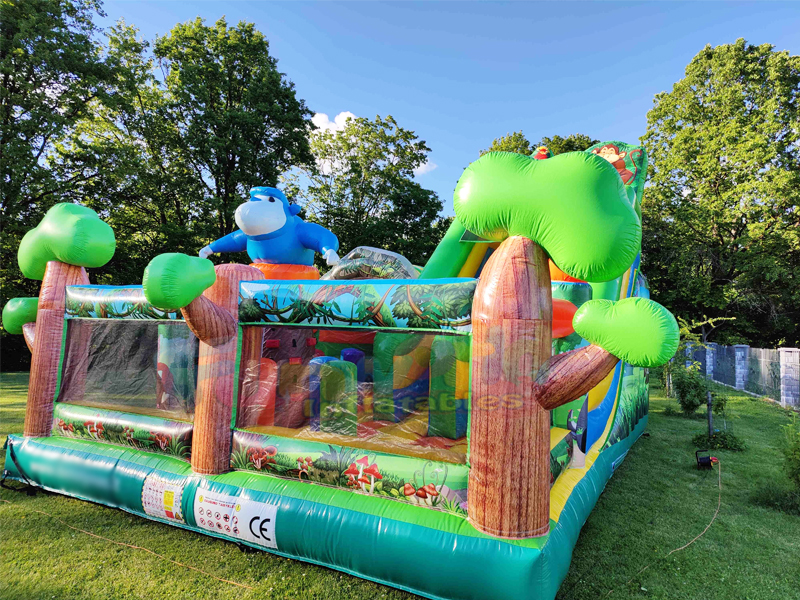 Dieser aufblasbare Zoopark-Kombi-Hüpfer ist eine große aufblasbare Hüpfburg mit Kletterrampe und Rutsche. Bietet Platz für ca. 8–10 Kinder. Nach dem Spieltag lässt sich die Luft aus dem Hüpfer mithilfe der Reißverschlussklappen leicht entleeren und zum Verstauen abnehmen. Der Bouncer besteht zu 100 % aus PVC-Vinyl, von den aufrechten Säulen und Balken bis zu den Gleitwänden. Alle stark beanspruchten Bereiche, einschließlich der Sprungfläche, der Matratzenseiten, der Unterseite und der Rutsche, bestehen aus industrietauglichem, 18 Unzen (0,55 mm) starkem PVC. Dieses pannensichere PVC-Material ist viel stärker (ungefähr fünfmal stärker) als Nylon, das in minderwertigen Geräten verwendet wird, da es nicht reißt, verblasst, sich bei der Verwendung abnutzt oder schimmelt und viel einfacher zu reinigen ist.