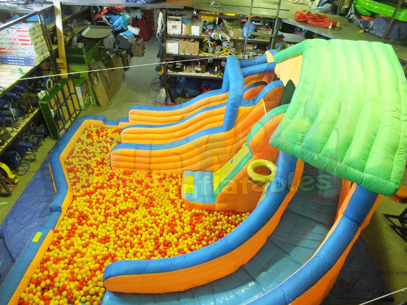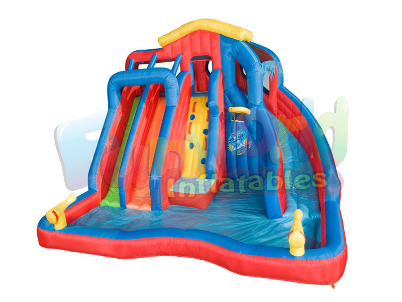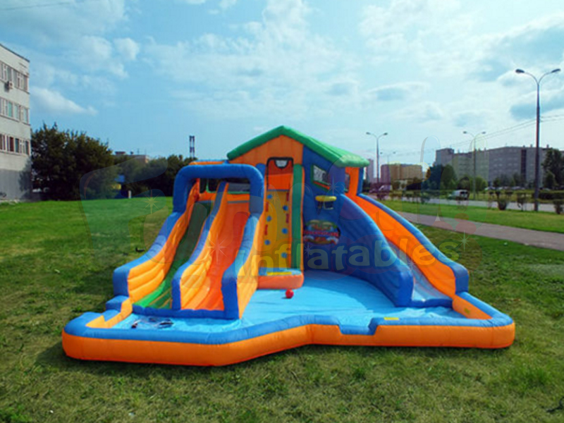 Kinder rasen zwei aufblasbare Wasserrutschen entlang, erklimmen eine Kletterwand und zielen mit zwei Wasserwerfern im Wasserpark, der sich in drei Minuten aufbläst. Es bringt so viel Spaß in diesem aufblasbaren kommerziellen Wasserpark.