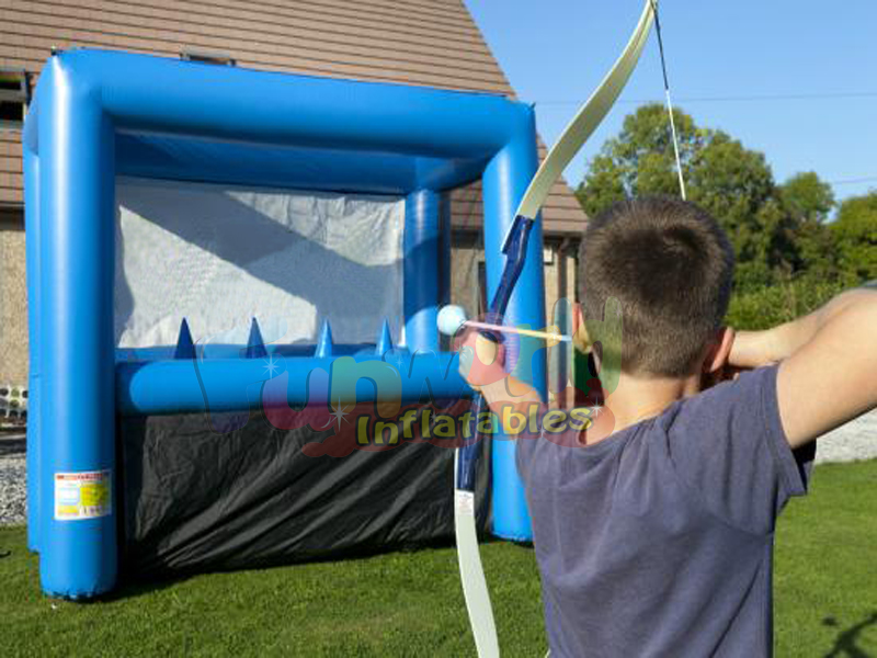Dit opblaasbare interactieve boogschietspel bevat zwevende doelen van verschillende grootte, gebruik gewoon de boog en veiligheidspijlen om je zwevende doel te raken. Met dit veilige en uitdagende item kunnen kinderen en volwassenen hun boog tekenen en hun 'niet-dodelijke' pijlen met schuimpunt op de 4 zwevende, plastic, ronde doelen richten en wegvuren. De aantrekkelijke felblauwe kleur van de schuimrubberen pijlen en de uitdaging van de zweefballen zal ervoor zorgen dat iedereen in de rij staat! Het springkussen kan binnen, buiten of waar uw evenement ook plaatsvindt worden gebruikt. Plezier voor alle leeftijden en vaardigheidsniveaus: uw interactieve zweefboogschieten biedt een leuke optie op verjaardagsfeestjes en barfeesten.