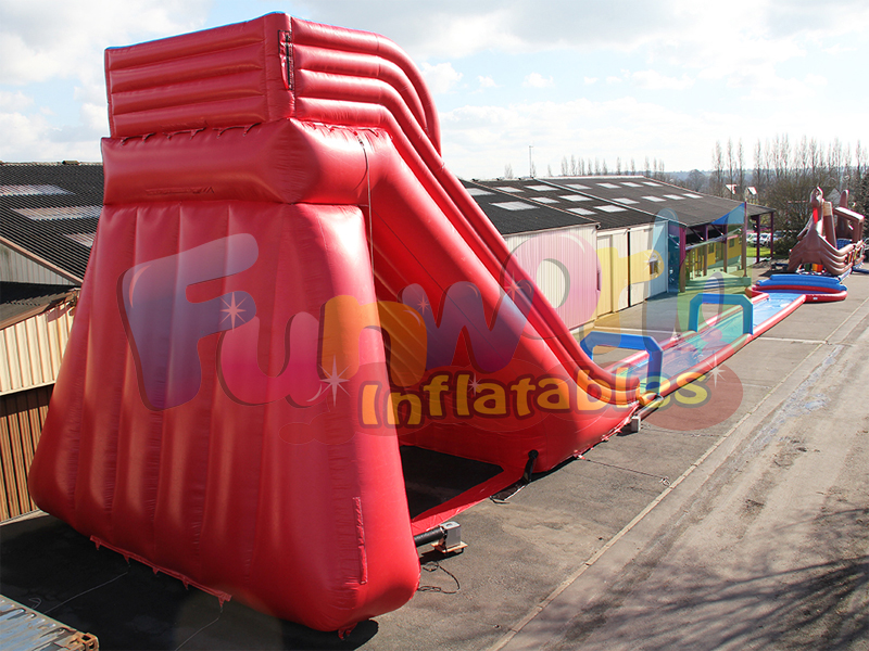 Een gigantische opblaasbare waterglijbaan voor volwassenen met een start op 8.5m