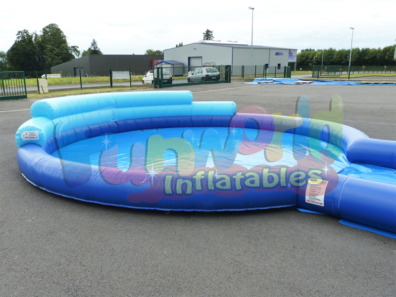 De waterbaan waterglijbaan op zeildoek bestaat uit 3 modules. De openluchtglijbaan met zwembad begint met een klim gemaakt van antislipschuimtreden, de klim wordt gescheiden door een centrale muur om mensen die schuiven te beschermen. Eenmaal op de top van het platform van 8,5 m, moet je alleen nog op de helling van 45 ° beginnen. Op de bodem van de glijbaan gaat u horizontaal verder om de finish te bereiken van Ø6,5 m beschermd door stopmuren. De waterglijbaan wordt bewaterd door geboorde waterleidingen (niet meegeleverd) bovenaan de schuif en onder de bogen. Met schokdempende schuimverbinding tussen de schuifovergang en de verlenging.