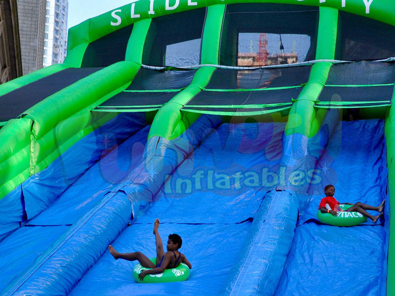 De slipvaste glijbaan voor volwassenen is gemaakt van extra dik, stevig, superglad reliëf PVC. In feite is het meer dan twee keer zo dik als de meeste gigantische opblaasbare glijbanen die je op de markt vindt. En je hoeft geen afwasmiddel toe te voegen om deze glad te houden. Ons 25-inch ingebed sprinklersysteem met zig-zag patroon sluit aan op de standaard achtertuin slang, loopt over de lengte van de glijbaan en heeft 100% waterdekking, dus geen droge plekken. We hebben ook pontons aan de zijkant geïnstalleerd om het water op de glijbaan te houden, net als je kinderen!
