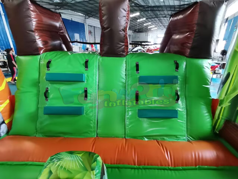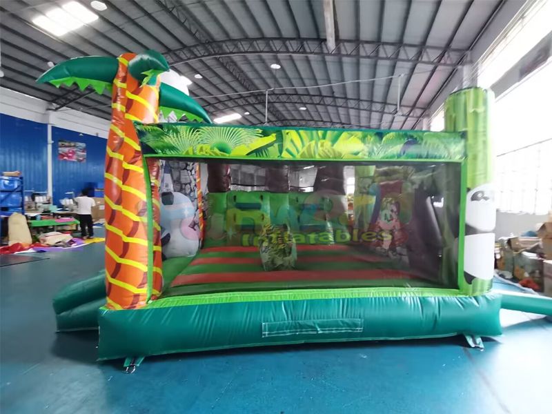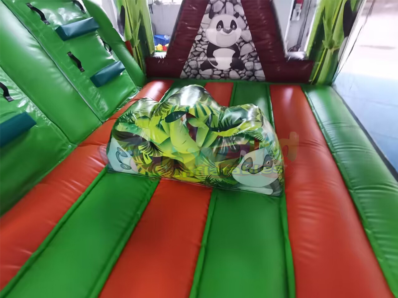 Ce videur combiné panda gonflable est une grande maison gonflable avec rampe d'escalade et toboggan. Capacité d'accueil d'environ 8 à 10 enfants. Une fois la journée de jeu terminée, les rabats zippés permettent de dégonfler et de démonter facilement le transat pour le ranger. Le videur est construit à partir de vinyle 100 % PVC, de ses piliers et poutres verticaux jusqu'à ses parois coulissantes. Toutes les zones à forte contrainte, y compris la surface de rebond, les côtés du matelas, le fond et le toboggan, sont fabriquées à partir de PVC de 18 onces (0,55 mm) de qualité industrielle. Ce matériau PVC increvable est beaucoup plus résistant (environ 5 fois plus résistant) que le nylon utilisé dans les unités de moindre qualité, car il ne se déchirera pas, ne se décolorera pas, ne s'usera pas à l'usage et ne moisira pas, et il est beaucoup plus facile à nettoyer.