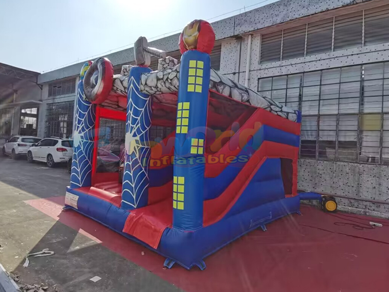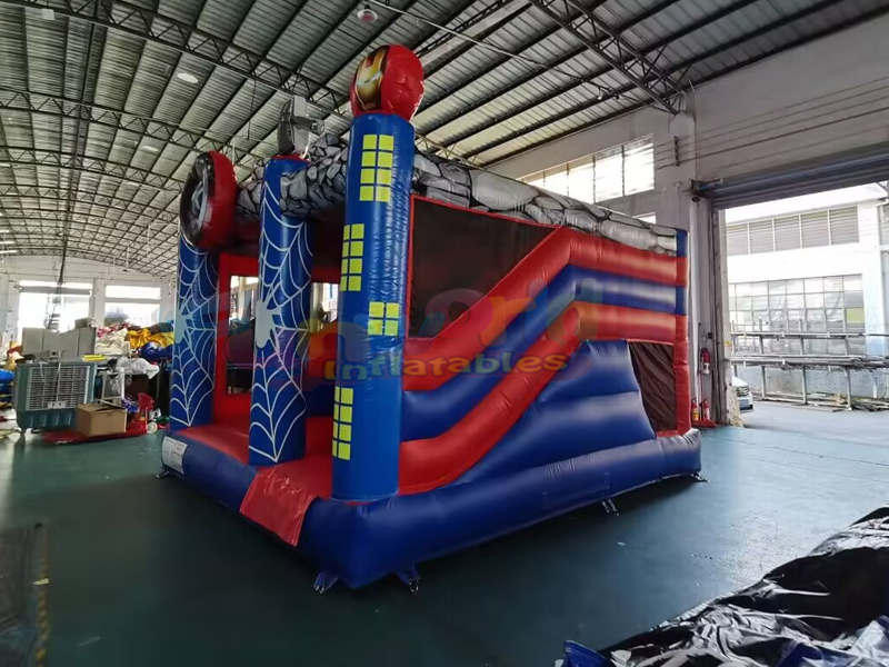 Ce videur combo super-héros gonflable est une grande maison gonflable avec rampe d'escalade et toboggan. Capacité d'accueil d'environ 8 à 10 enfants. Une fois la journée de jeu terminée, les rabats zippés permettent de dégonfler et de démonter facilement le transat pour le ranger. Le videur est construit à partir de vinyle 100 % PVC, de ses piliers et poutres verticaux jusqu'à ses parois coulissantes. Toutes les zones à forte contrainte, y compris la surface de rebond, les côtés du matelas, le fond et le toboggan, sont fabriquées à partir de PVC de 18 onces (0,55 mm) de qualité industrielle. Ce matériau PVC increvable est beaucoup plus résistant (environ 5 fois plus résistant) que le nylon utilisé dans les unités de moindre qualité, car il ne se déchirera pas, ne se décolorera pas, ne s'usera pas à l'usage et ne moisira pas, et il est beaucoup plus facile à nettoyer.