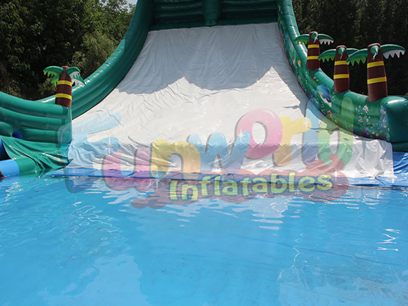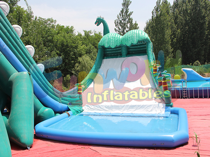 Le parc aquatique gonflable de dinosaure est associé à une glissade gonflable passionnante avec la piscine. Vous devez jouer pour commencer avec la queue du dinosaure. Après avoir grimpé et glissé vers le bas de la queue, la force d'inertie amènera le plus haut lieu près de la tête du dinosaure. Enfin, vous entrerez dans la piscine. C'est tellement intéressant qu'on dirait que des gens glissent à l'intérieur d'un toboggan gonflable géant.