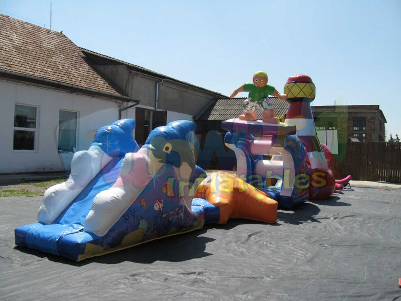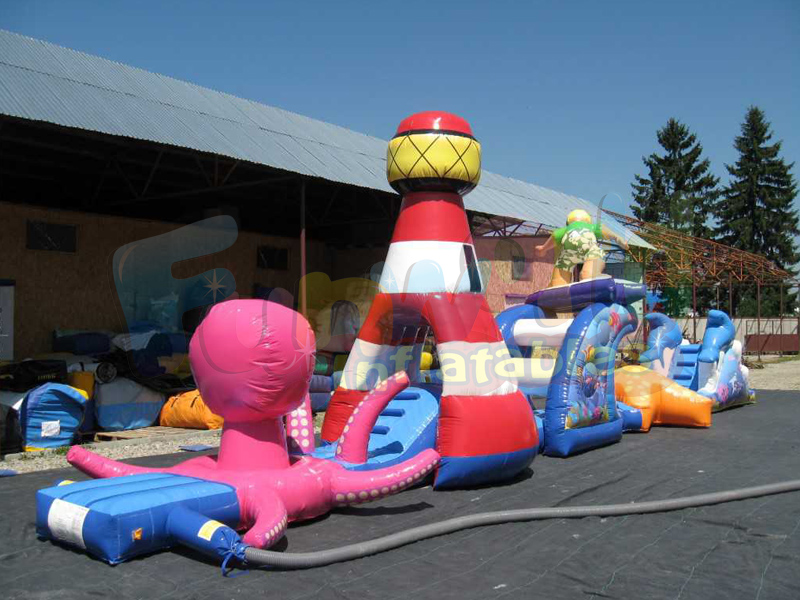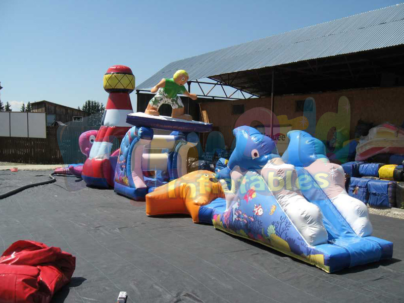 Étourdissant?. Absolument magnifique! le parcours d'obstacles flottant et gonflable est un produit absolument époustouflant que nos clients ne pourront jamais vraiment apprécier tant qu'il n'aura pas été reçu, gonflé et vu flotter dans leur piscine ou leur espace de jeux aquatiques. Le design a pris des semaines à créer et est parfaitement chorégraphié pour l'aqua run. Le thème de la piscine, qui fait exploser les jouets, est celui du bord de mer. Les éclaboussures d’océan et d’océan comptent parmi les images, les objets et les obstacles les plus glorieux jamais créés. Le surfer et le tunnel du phare sont les points focaux de cette grande piscine gonflable. Ils dominent l’eau.