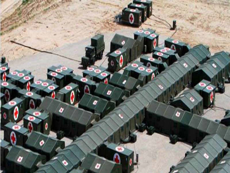 Structure gonflable de l'hôpital - la partie médicale est conçue comme une unité médicale autonome séparée avec un support technique complet. Il est conçu comme une unité modulaire, les unités hospitalières individuelles sont autonomes et peuvent être déployées séparément. La partie centrale de l'hôpital est formée par un couloir construit à partir de tentes gonflables, qui sont reliées des deux côtés à un seul conteneur ou à des lieux de travail sous tente via des modules de connexion. Toute augmentation du nombre de patients couchés peut être résolue de manière modulaire, ce qui garantit une connectivité à 100% avec les unités fonctionnelles existantes.