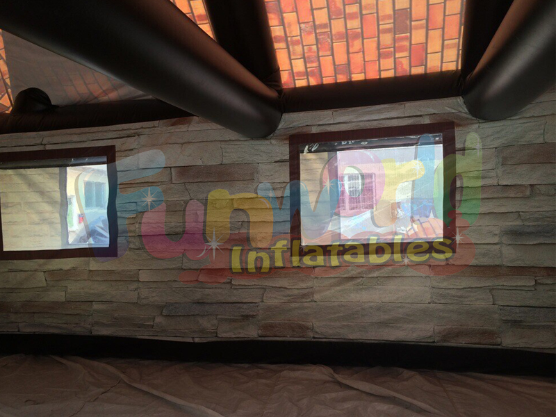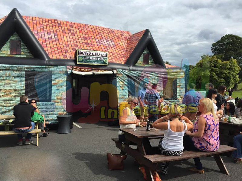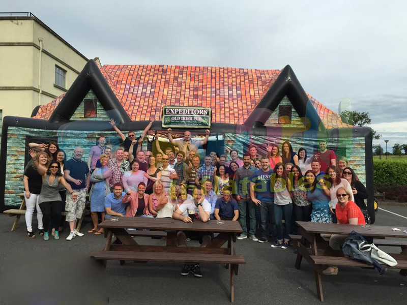 Notre pub gonflable mesure 26 'de long, 16' de large et 16 'de haut et nécessite un espace libre de 30' x 20 'pour un fonctionnement correct. Il a deux entrées, une à l'avant et une à l'arrière. Le pub irlandais gonflable peut accueillir environ 70 personnes debout ou 36 personnes assises. Notre plus petit pub, 'The Saloon' mesure 16 'de long sur 15' de large et 16 'de haut et nécessite une surface de 20' x 20 'pour une configuration avec des portes à l'avant et à l'arrière. Nous fournissons des lumières qui sont suspendues au plafond et d'autres objets sont disponibles en extra. Une barre d’explosion pour une fête ou une réunion de famille suffirait.