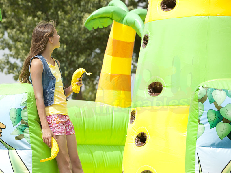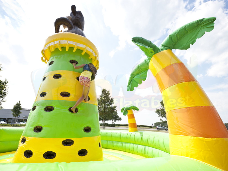 Un vero colpo d'occhio in ogni caso: una torre di arrampicata a tema giungla. Questa torre di arrampicata gonfiabile è altamente raccomandata. I bambini devono cercare di arrampicarsi il più rapidamente possibile per ottenere le banane. Sulla cima della torre rampicante è un sorprendente oggetto 3D che si adatta al tema.