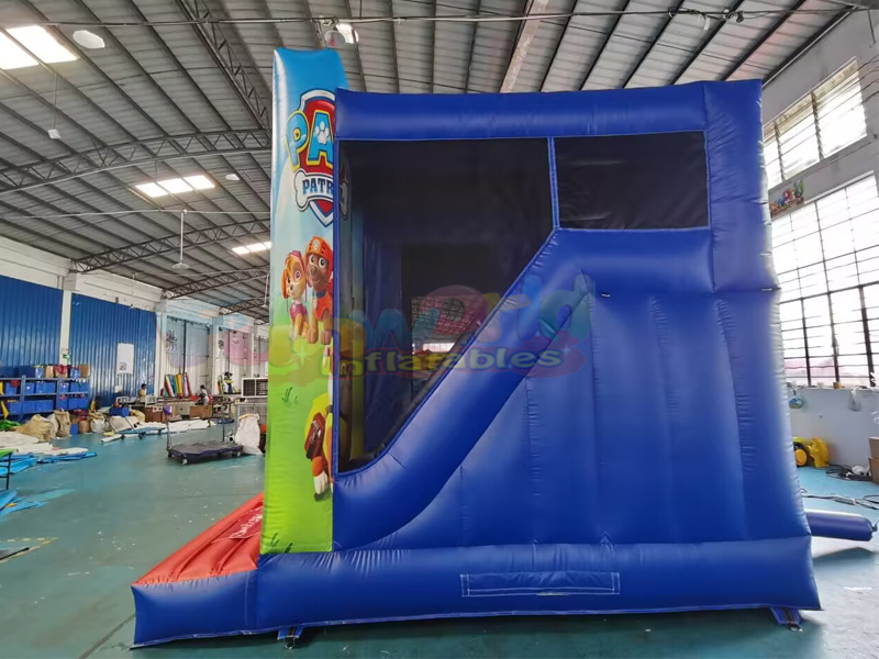 This inflatable paw patrol bouncer is a large inflatable bounce house with climbing ramp and slide. Features a capacity of approximately 8-10 children . After the day of playing is through, zippered flaps allow the bouncer to be easily deflated and taken down for storage. Bouncer is constructed from 100% PVC vinyl, from its upright pillars and beams to its slide walls. All high-stress areas, including the bouncing surface, mattress sides, bottom, and slide are made from industrial strength, 18-ounce (0.55mm) PVC. This puncture-proof PVC material is much stronger (approximately 5X stronger) than nylon used in lesser-quality units as it won't tear, fade, wear out with use, or get moldy, and it is far easier to clean."