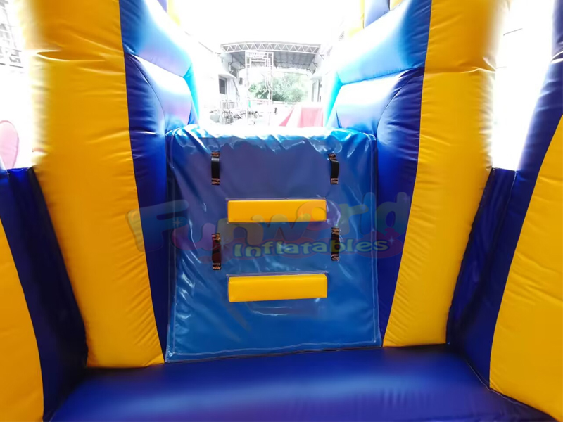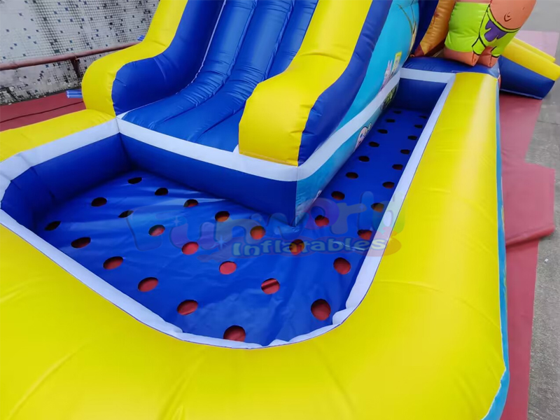 This inflatable spongebob combo bouncer is a large inflatable bounce house with climbing ramp and slide. Features a capacity of approximately 8-10 children . After the day of playing is through, zippered flaps allow the bouncer to be easily deflated and taken down for storage. Bouncer is constructed from 100% PVC vinyl, from its upright pillars and beams to its slide walls. All high-stress areas, including the bouncing surface, mattress sides, bottom, and slide are made from industrial strength, 18-ounce (0.55mm) PVC. This puncture-proof PVC material is much stronger (approximately 5X stronger) than nylon used in lesser-quality units as it won't tear, fade, wear out with use, or get moldy, and it is far easier to clean."