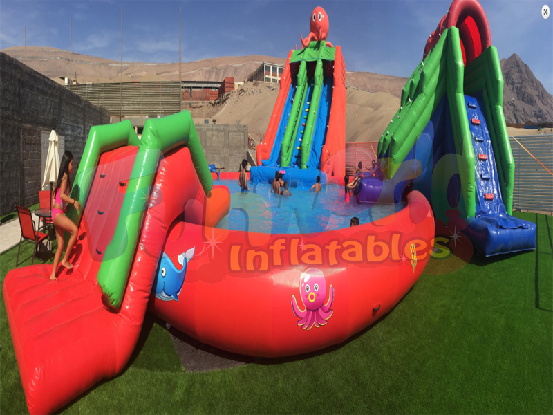 Different from the gentle design of the bottom of the general inflatable water slide with pool, the design of the slope of the bottom of the trap is so that when people slide down to the bottom through the top of the slide, they don't simply rush into the water, but fly a high distance through the slope and then from the distance. Falling in the air is more exciting and interesting, and it is very suitable for young people!
